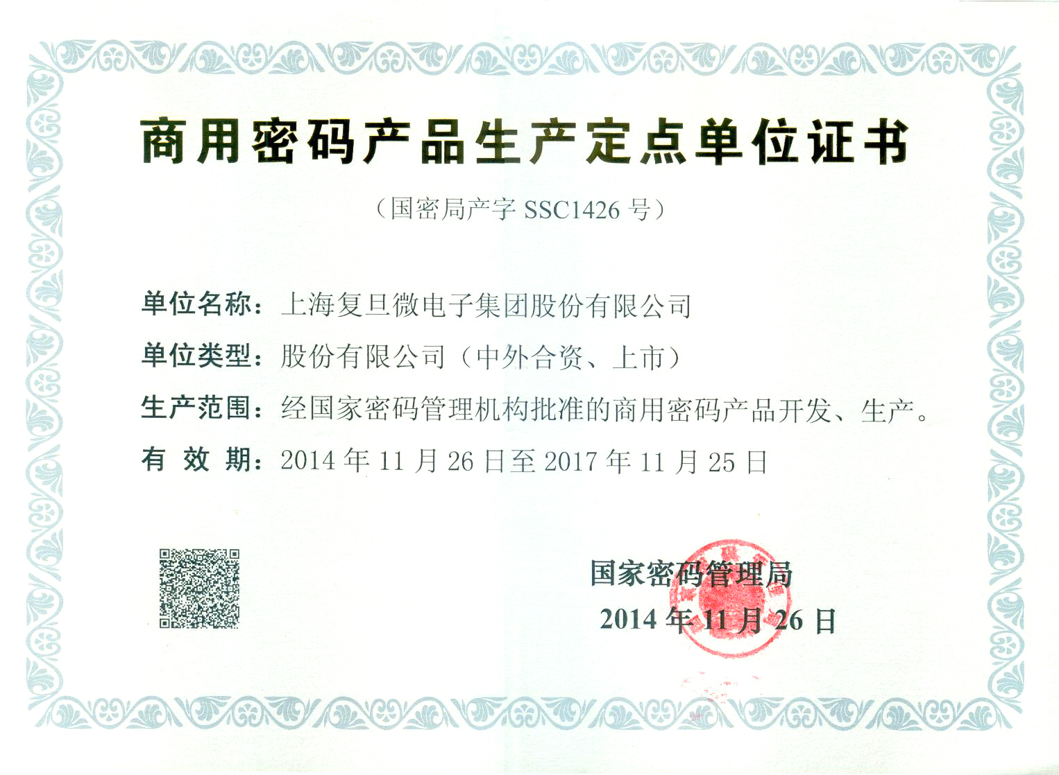 商用密碼產品生產定點單位證書